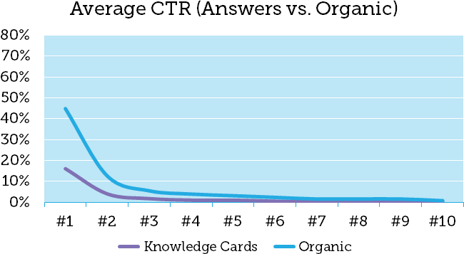 Results with sitelinks in the #1 position have a massive 80% average CTR, with a steep drop to #2. These two curves represent two wildly different animals. Now, let's look at SERPs with Knowledge Cards (AKA "answer boxes" – Knowledge Graph entities with no organic link)...