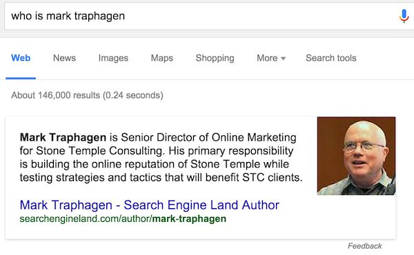 The project is already underway. Take a moment right now and ask Google, "Who is Mark Traphagen?" If you are in the US or most English-speaking countries, you'll probably see this at the top of the results: