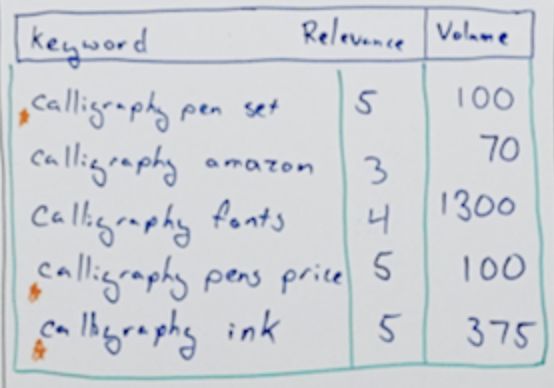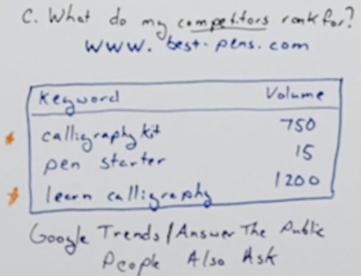 The first is simply, "What do I want to rank for?" In this hypothetical example, our client sells calligraphy pens.