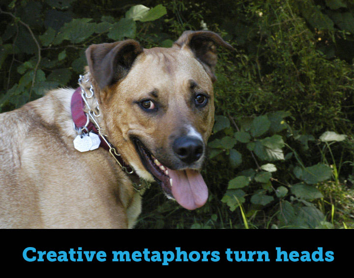 By making unexpected comparisons, metaphors and similes force words to perform like a stage mom on a reality show. These comparisons shake our brains awake and force us to pay attention. So apply a whip to your language. Make it dance like a ballerina in a little pink tutu. Give our brains something interesting to sink our teeth into (poor Rocky!), gnaw on, and share with out friends.