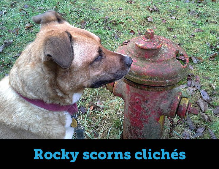 While that's a bit extreme (at least I hope so because that's a lot of dead puppies and Rocky's having second thoughts about his choice of parents), I hope it will remind you to read over what you've written and see where your attention starts to wander (wandering attention=cliché=one more tragic, senseless death) you get bored. Chances are it's right in the middle of a tired bit of language that used to be a wonderful word picture but has been used and abused to the point that we readers can't even summon the image anymore.