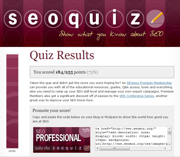 I'm just going to go ahead and average the two scores and say I got a 98%. But that's just a number... I still need a fancy SEOmoz logo to display it. For that, I resort to a little bit of reverse engineering. After a quick "optimization" of the HTML code I was given, I now proudly present my official SEOmoz SEO Expert Quiz score!