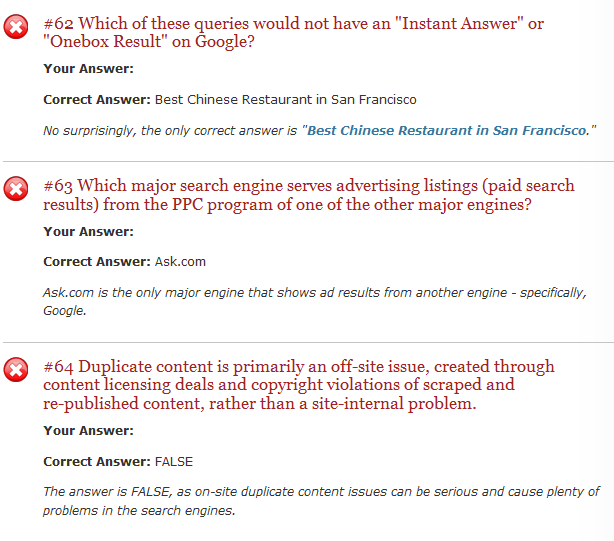 Up until about 3 weeks ago, I was working at a fairly well-known SEO firm, but unfortunately, my valid SEO theories and genius-grade ideas weren't welcome there, so I decided to strike out on my own! SEOs are a dime a dozen these days, so I have been looking for ways to differentiate myself and establish some sort of credibility... without having to namedrop my previous employer. The SEOmoz SEO Expert Quiz immediately grabbed my attention, and I vowed to unleash a fury of SEO information, the likes of which the world has never seen!