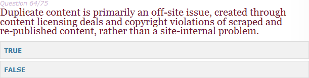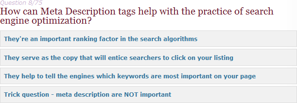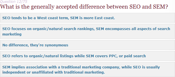 I can pretty easily justify adding those points to my "real" score, but these next ones are a bit trickier. I'll display the questions as screenshots, as not to make the test questions/answers any more "Googleable" than they have to be. I will also refer to the possible choices by A, B, C, etc., even though letters aren't actually displayed next to the answers.
