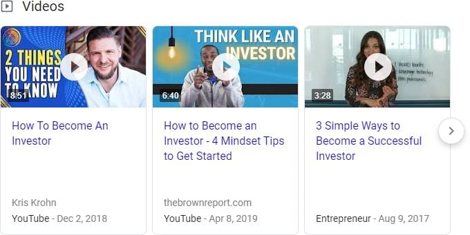 This carousel appeared on a search for “How to be an investor” (Step 1: Find a bag of money). Notice the arrow on the far-right — currently, searchers can scroll through up to ten videos. While our research tracked all ten positions, most of this report will focus on the three visible positions.