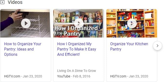 Pardon my grammar, but “How to…?” questions have become a hot spot for video results, and naturally lend themselves to niche players like HGTV. Here’s a video carousel from a search for “how to organize a pantry”: