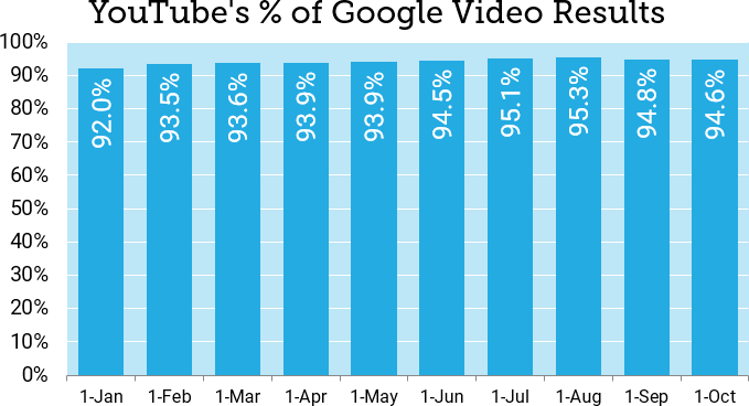 In a study of 2.1M searches and 766K videos, YouTube accounted for 94% of all video carousel results on page one of Google, leaving little room for competition.