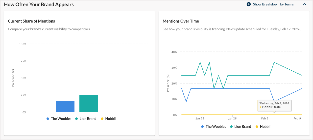 • Track your AI footprint: See exactly where and how often your brand is mentioned in AI-generated responses for up to 100 prompts.