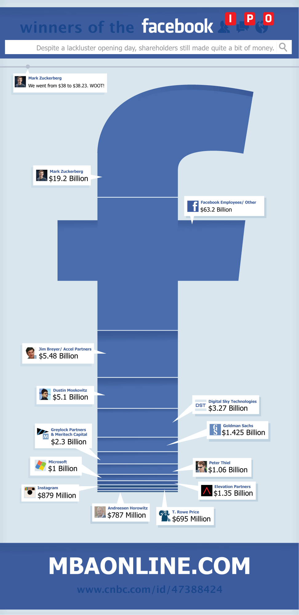 This infographic used a great hook to get a wide audience range interested– exploring who got rich from the IPO. The design illustrated this using a wonderfully simple approach. The infographic also gained attention by going against the grain; the sentiment at the time was that IPO was a failure. This infographic celebrates its success.