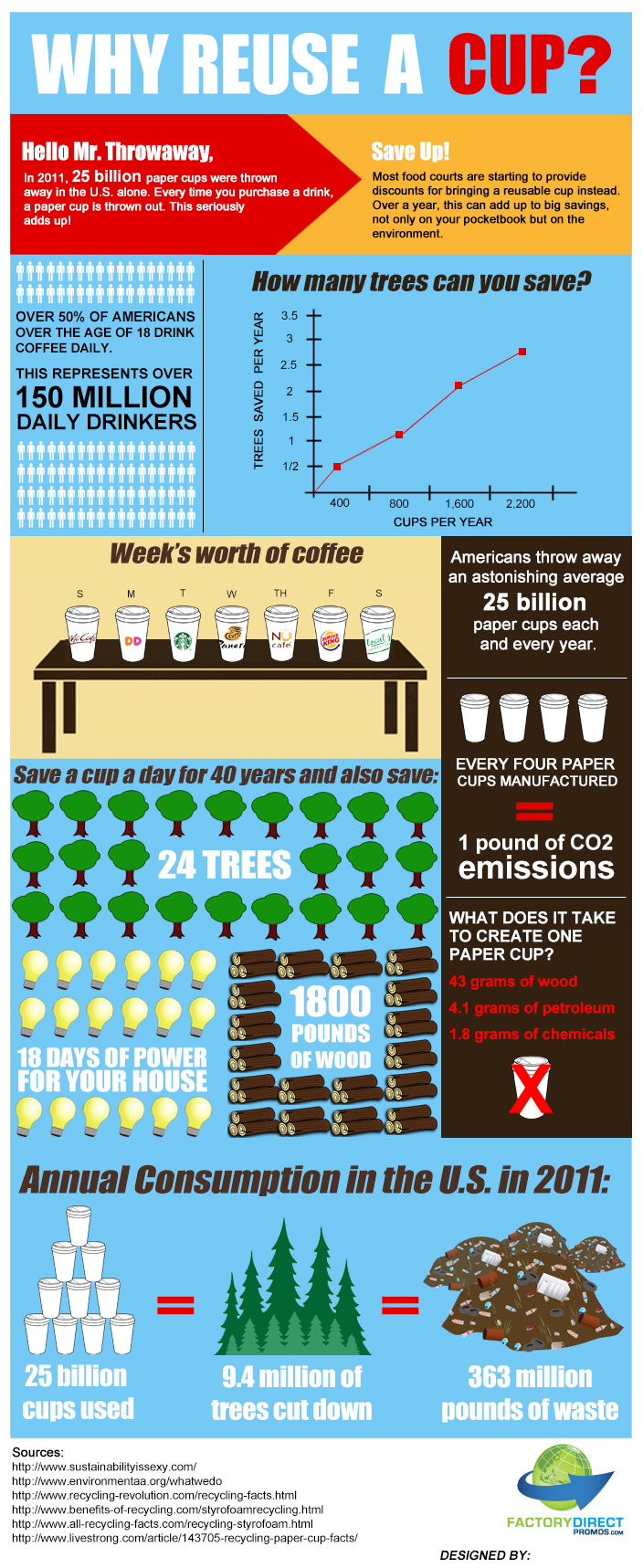 Factorydirectpromos.com creates reusable products such as bags, bottle and cups so the infographic fits in perfectly with their niche. This infographic is not perfect by any means, but it creates the hooks needed for bloggers and social media users to pick it up and write a story about the content.