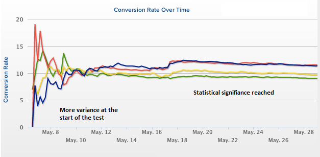 In any given split test you need a certain number of actions to reach “statistical significance” which essentially means the likelihood that the results reflect the truth and not just a fluke.